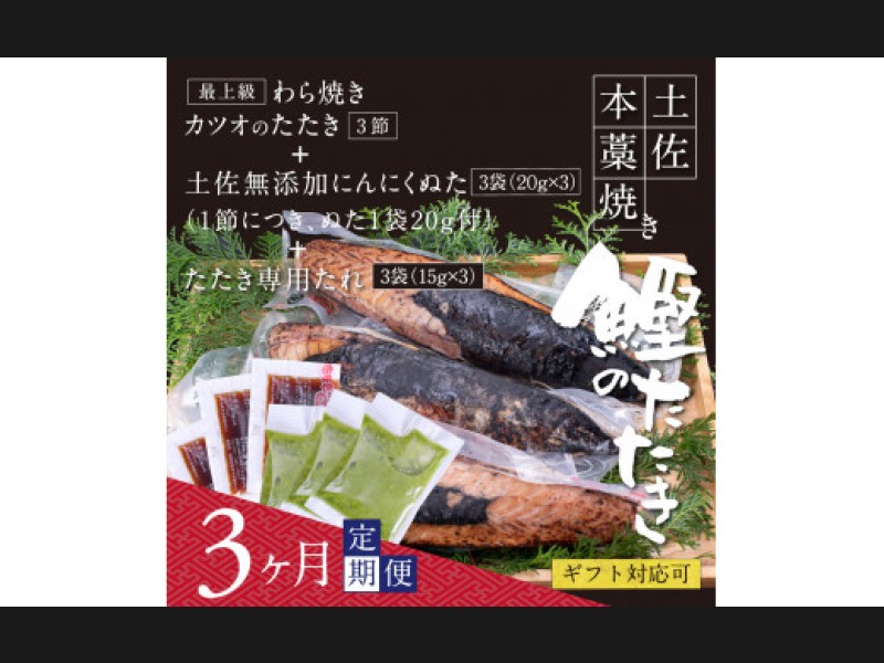 サイズ: 〈かつおのたたき×3節(鰹の大きさには個体差があり、1節約320g~360g以上)、有機無添加土佐にんにくぬた 20ml×3袋、たたきのタレ15ml×3袋、おろしニンニク2g×3袋〉×3か月
