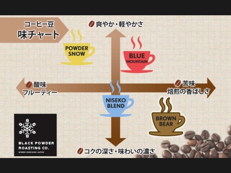 珈琲の名前にも、ニセコと焙煎の深さを連想できるユニークなネーミングをつけています♪