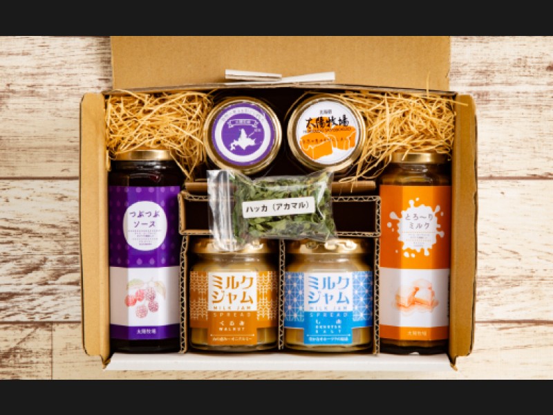 サイズ: つぶつぶソース(ブラックベリー)160g×1、ミルクソース(キャラメル)160g×1、ミルクジャム(オホーツクの塩)130g×1、ミルクジャム(くるみ)130g×1、ミルクジャム(キャラメル)70g×1、ジャム(ブラックベリー)70g×1、ハーブティー(ハマナスローズヒップとハッカ)×1