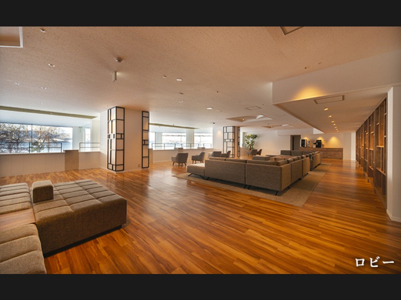 総ガラス張りのロビー、テラスからは洞爺湖が一望できます。湖面に太陽や月の光が反射し遠くに山々が連なっている様子は、まるで風景画のような美しさです。