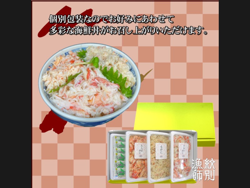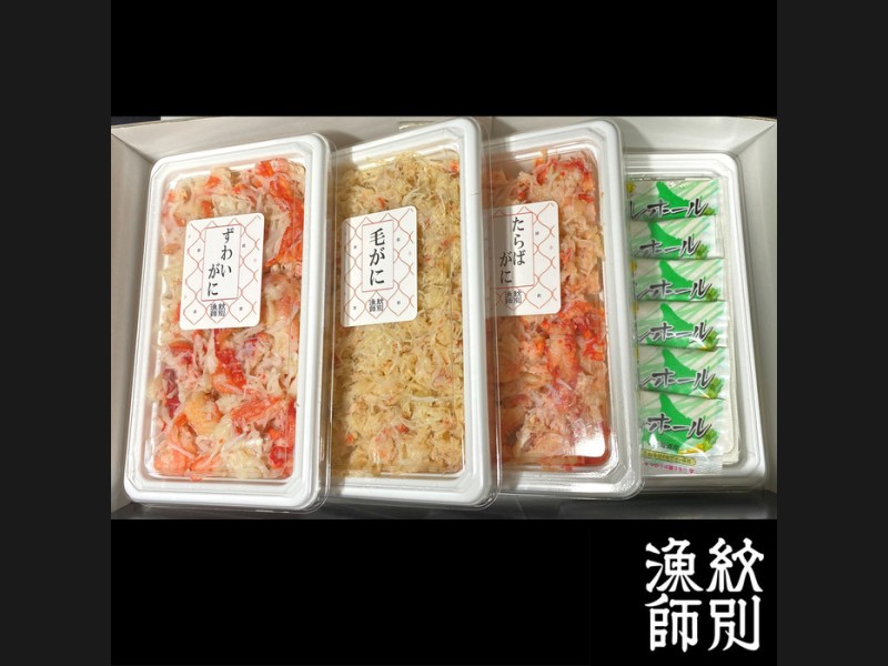 【原産地】毛がに、ずわいがに:北海道沖産、たらばがに:北海道沖産又はアメリカ産又はロシア産