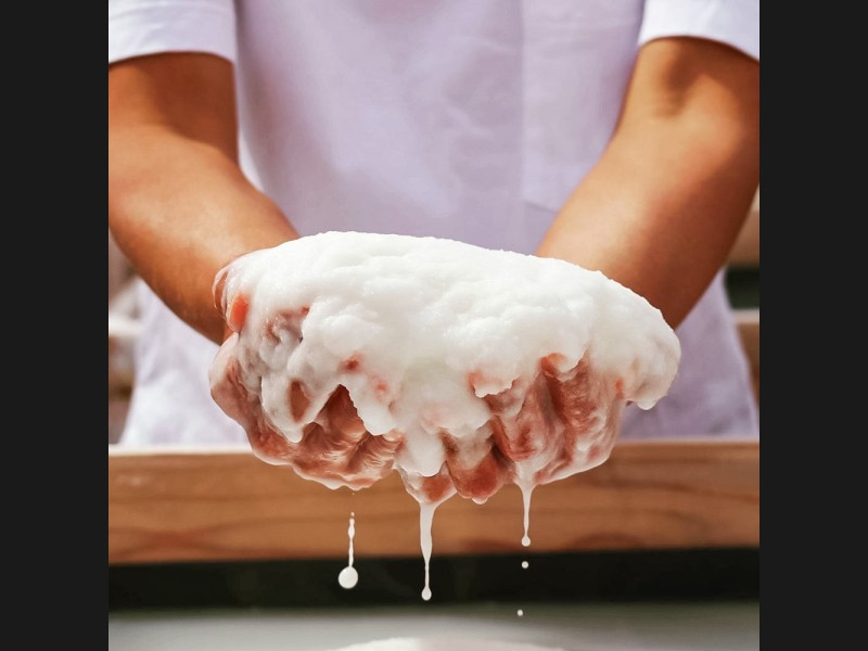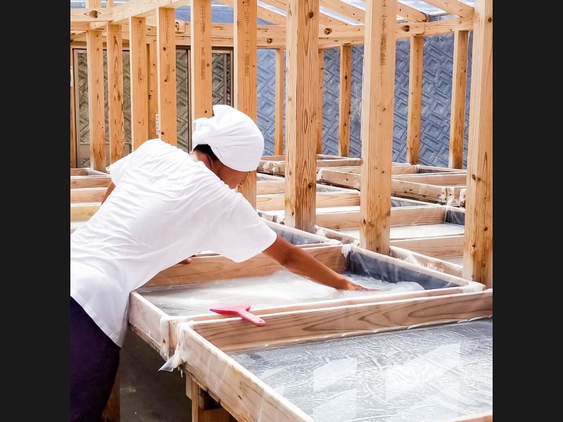 夏には60℃を超える製塩ハウスの中で、一日に幾度も攪拌作業を繰り返し、いくつかの季節を超え、ゆっくりと結晶化させていきます。
