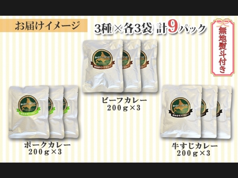 《無地熨斗対応》北海道 倶知安町の味覚がぎゅっと詰まった、こだわりのカレー3種(ビーフ・ポーク・牛すじ)の計9個セットです。