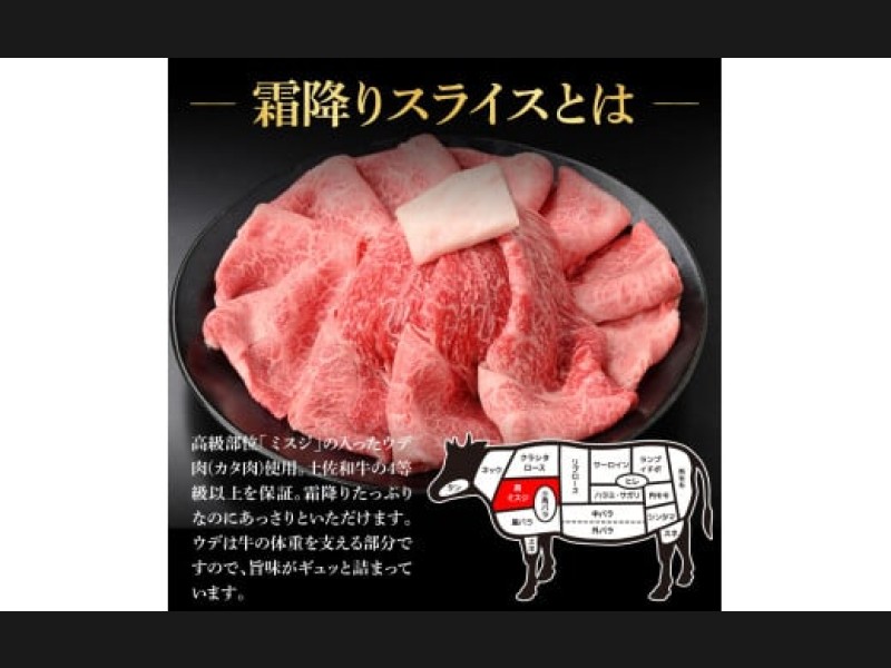 高級部位「ミスジ」の入ったウデ肉(カタ肉)使用。土佐和牛の4等級以上を保証。霜降りたっぷりなのにあっさりといただけます。ウデは牛の体重を支える部分ですので、旨味がギュッと詰まってます。すき焼き・しゃぶしゃぶに最適です。
