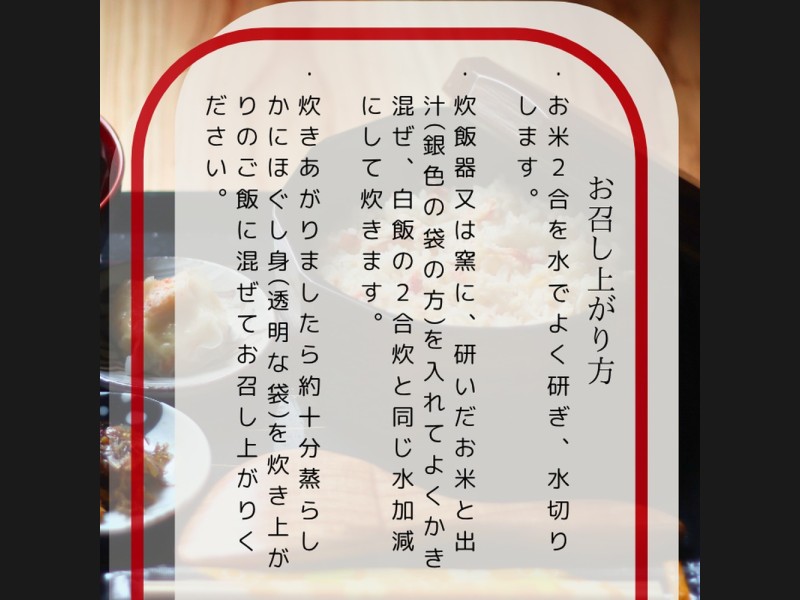 炊き上げ用の出汁とかにの身を別々にパッケージしておりますので、炊きあがったご飯に混ぜ込むもよし、ご飯にのせて楽しむもよし。お好みの食べ方でお召し上がり下さい。