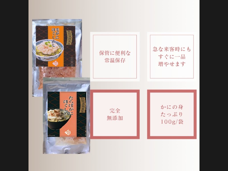 サイズ: たらばがにほぐしめし400g、毛がにほぐしめし400g各1個 ※1個2合炊き用(2人前)