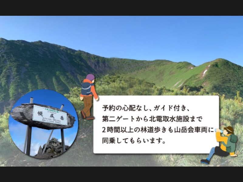 予約の心配なし、ガイド付き、第2ゲートから北海道電力取水施設までの約8キロ2時間半以上の林道歩きも山岳会車両に同乗してもらいます。