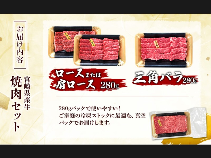 宮崎県産 黒牛 焼肉 赤身 牛肉 焼肉セット ロース 肩ロース 三角バラ 2点盛り 560g(280g × 2パック)焼肉...