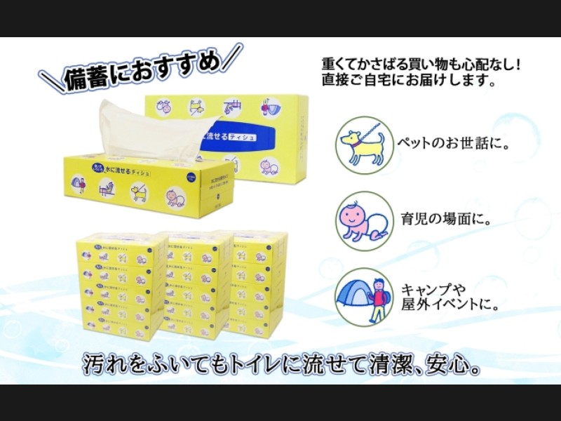 水に流せるティッシュなのでゴミ捨てがらくらく、汚れをふいてもそのままトイレに流せるため清潔、安心です。