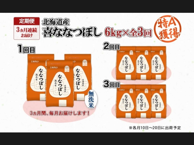 定期便 3ヵ月連続3回 北海道産 喜ななつぼし 無洗米 2kg×3袋 計6kg 米 特A 白米 小分け お取り寄せ なな...
