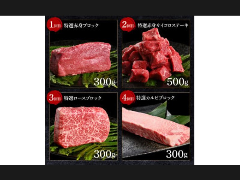 サイズ: 土佐あかうし特選赤身ブロック肉300g(赤身=モモ)・特選赤身サイコロステーキ500g(赤身=モモ)・特選ロースブロック300g・特選カルビブロック300g・特選カルビサイコロステーキ500g・特選スネ肉煮込み角切り500g・特選ヒレ肉サイコロステーキ500g・特選サーロインステーキ200g×2枚