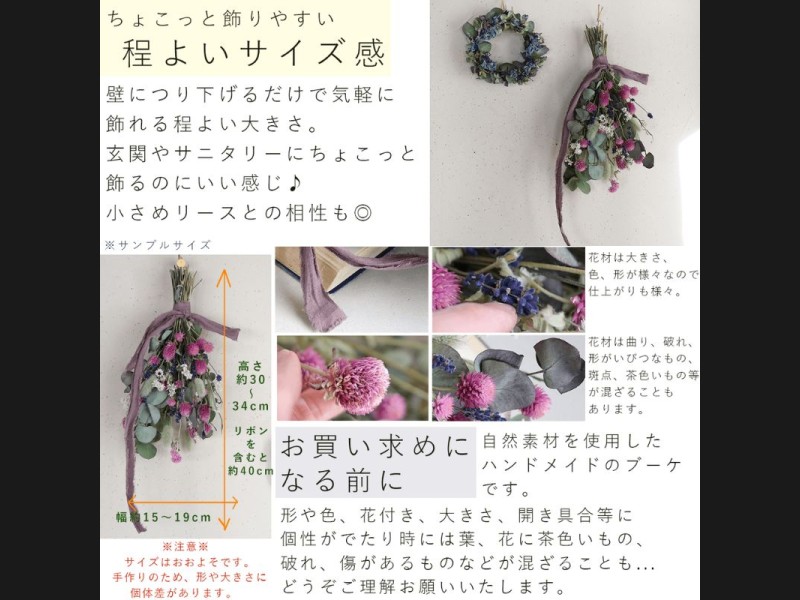 ※ドライフラワースワッグの形や大きさ、色、花の付き方、雰囲気には個性があります。