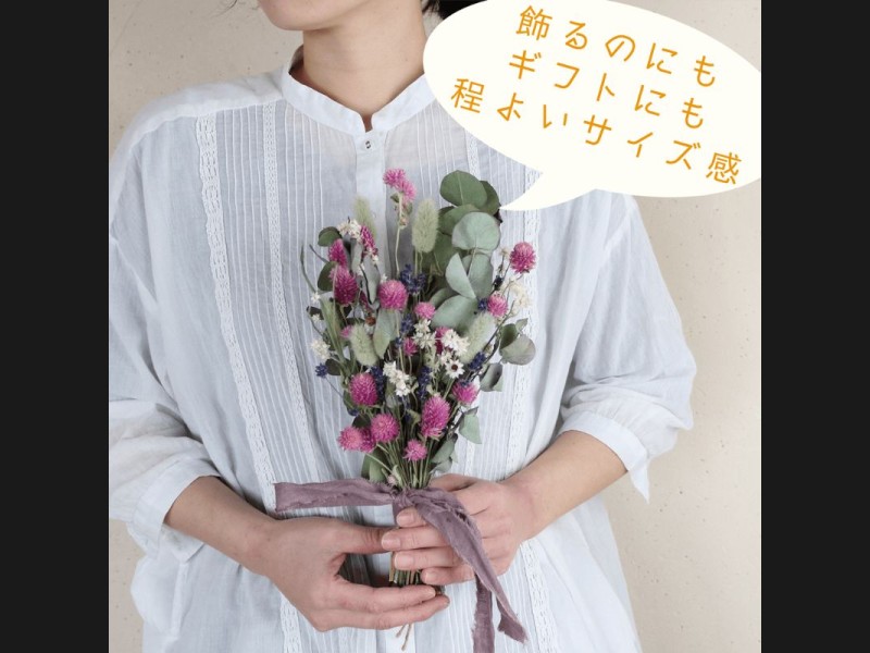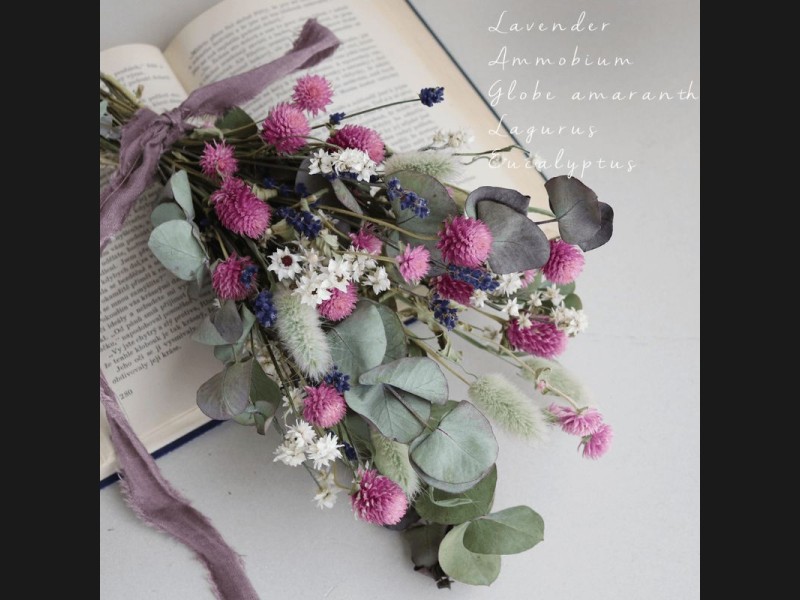 ●使用花材:千日紅ライラックピンク・アンモビューム・富良野産ラベンダー3号・ユーカリ銀世界・ラグラス(ドライフラワー)