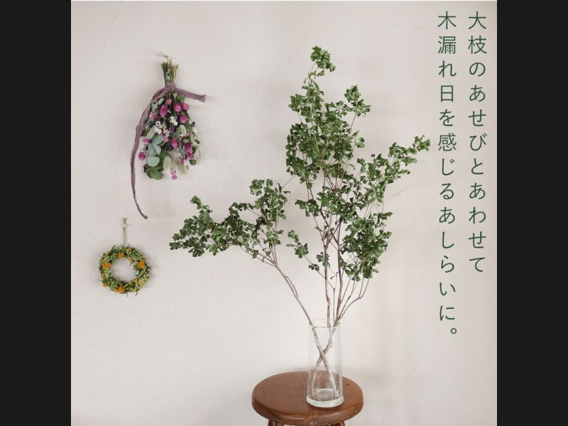小さめリースや大きなグリーンの枝ものとあわせてボタニカルインテリア。