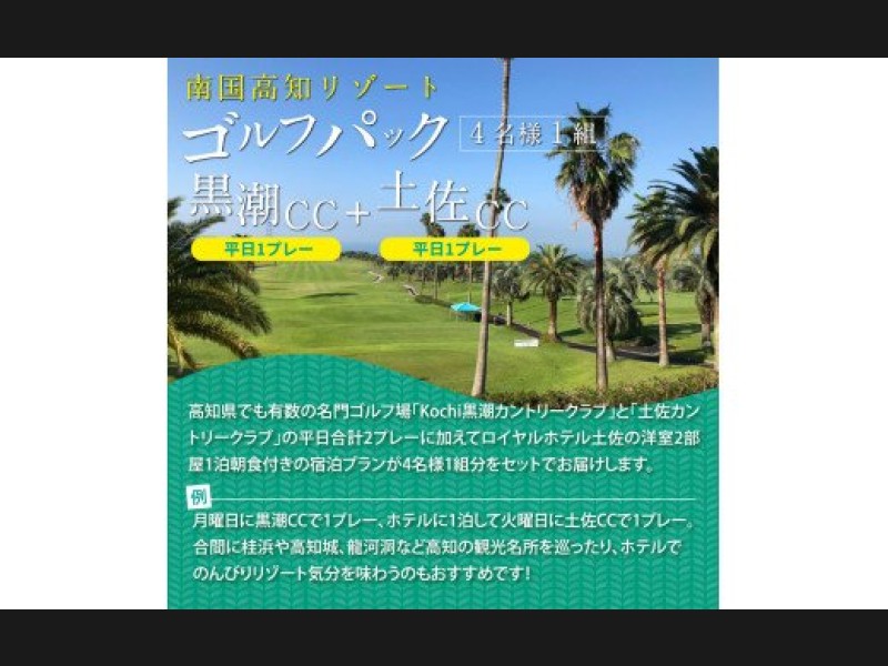 ○ゴルフ内容:カシオワールドオープン開催コースであるKochi 黒潮カントリークラブ、明治安田生命レディス ヨコハマタイヤゴルフトーナメント開催コースである土佐カントリークラブ、両ゴルフ場の4名様/1組「セルフプレー」がセットになっております。