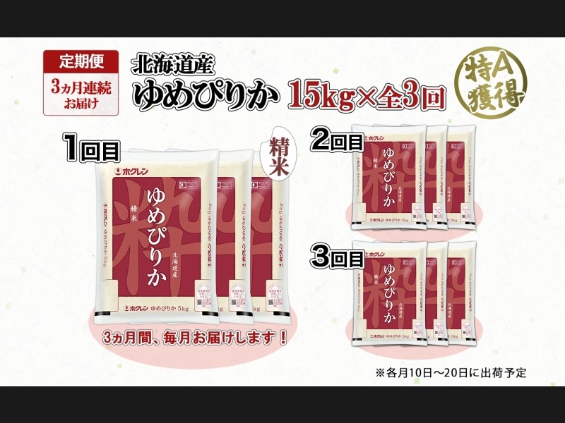 北海道の特A米『ゆめぴりか』精米 15kg(5kg×3袋)×全3回をお届けします。