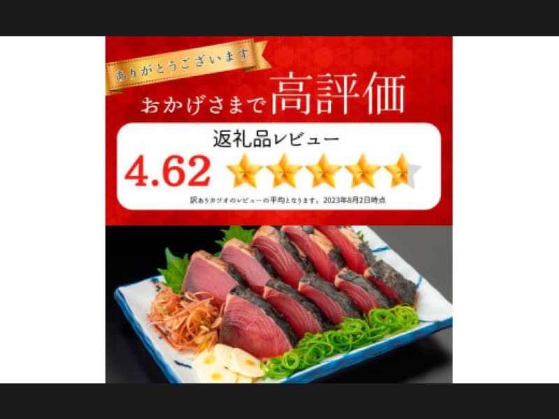高知といえばカツオのタタキ。キズ等で規格外となった【訳あり】カツオのわら焼きタタキです。キズ等により、形が揃っていない大きさ規格外のカツオですが、品質や食味等には全く問題なく、お召し上がりいただけます。