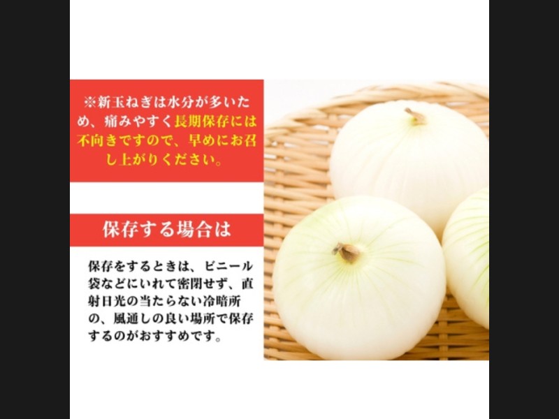 新玉ねぎは水分が多いため。痛みやすく長期保存には不向きですので、早めにお召し上がりください。
