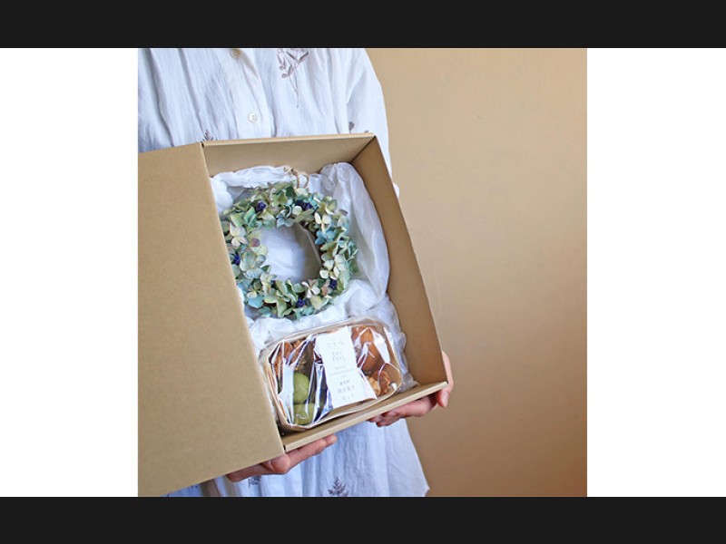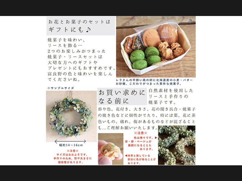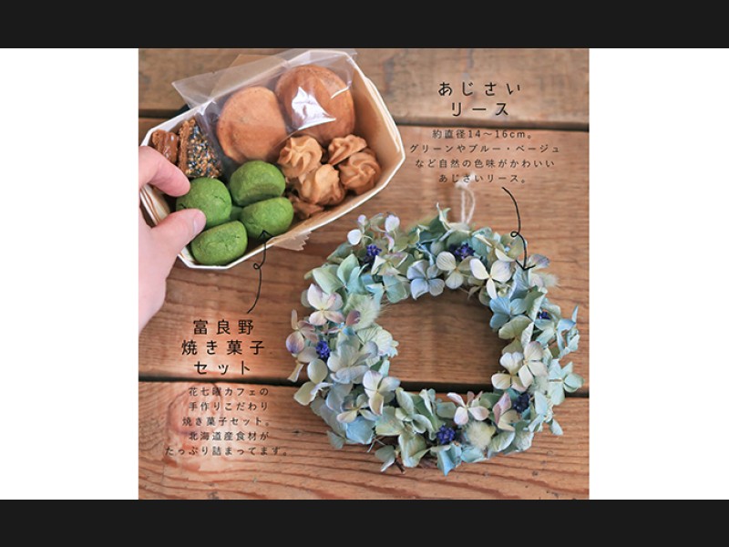富良野花七曜のドライフラワーリースと焼菓子セット * あじさいのリース お菓子 スイーツ 詰合せ