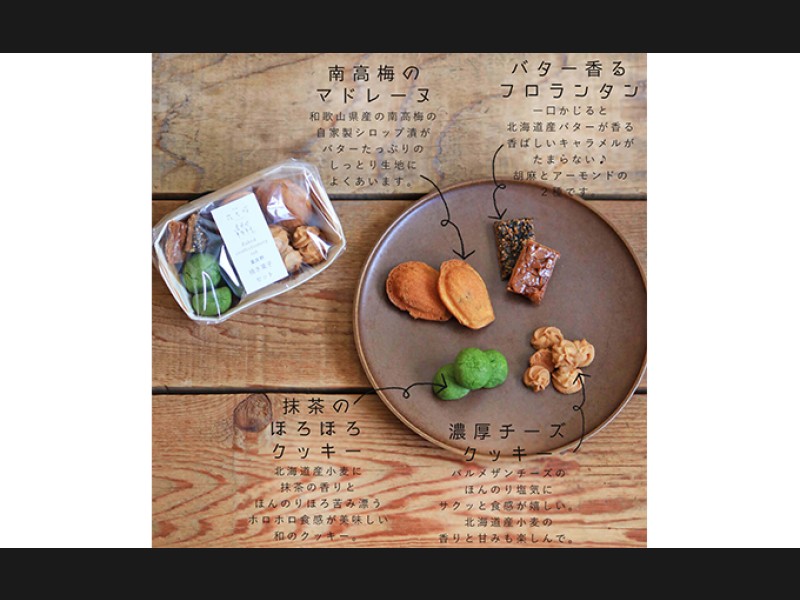 南高梅のマドレーヌにチーズクッキー、ほろほろ抹茶クッキー、フロランタン。