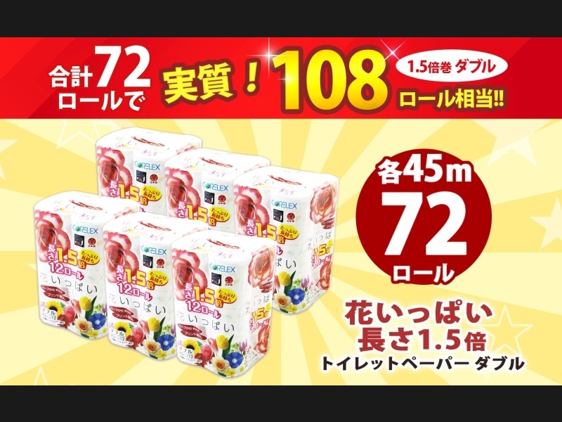 たっぷり長持ち!1.5倍巻き 花いっぱい トイレットペーパー(ダブル)45m 計72ロールセットです。