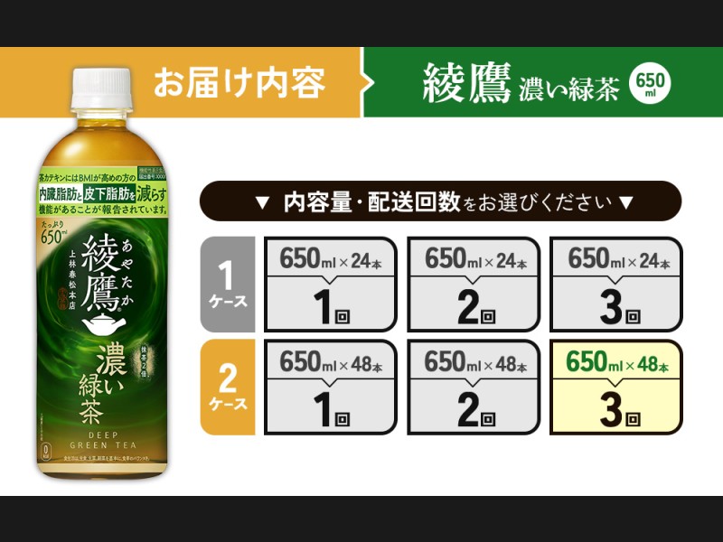 (3回定期便)綾鷹 濃い緑茶 650ml PET【コカ・コーラ】ペットボトル 2ケース(48本) 定期便 3回(144本) ...