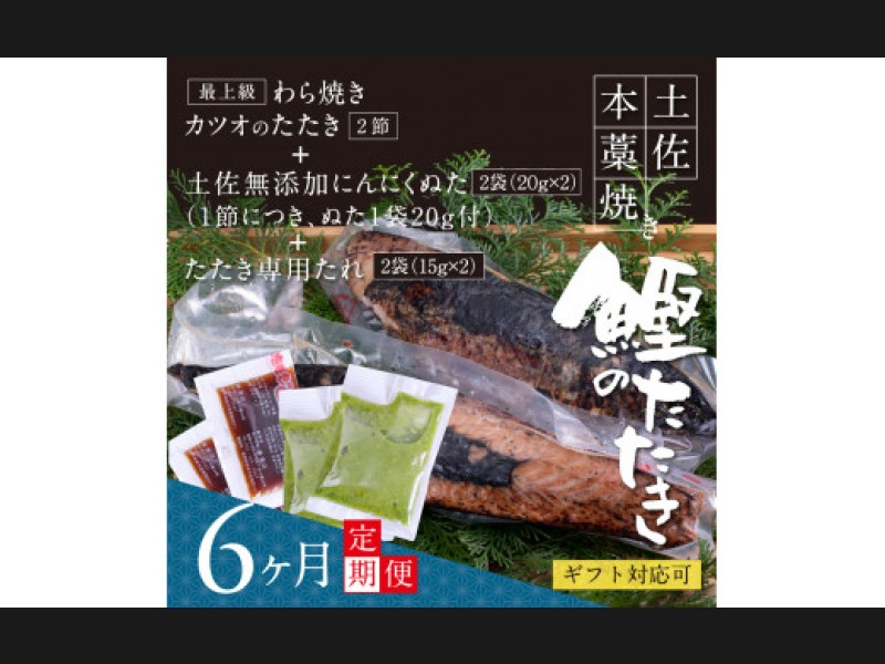 サイズ: 〈かつおのたたき×2節(鰹の大きさには個体差があり、1節約320g~360g以上)、有機無添加土佐にんにくぬた 20ml×2袋、たたきのタレ15ml×2袋、おろしニンニク2g×2袋〉×6か月