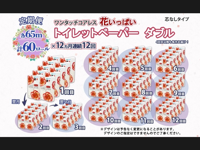北海道 定期便 12ヵ月連続 ワンタッチコアレス 花いっぱい トイレットペーパー ダブル 65m巻 60ロール ...
