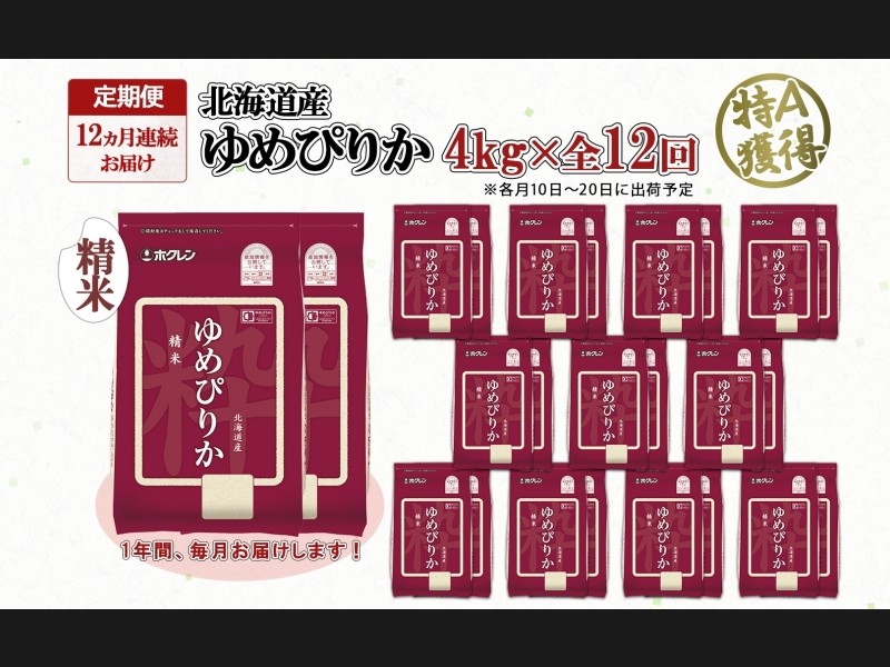 定期便 12ヵ月連続12回 北海道産 ゆめぴりか 精米 4kg 米 特A 獲得 白米 ごはん 道産 4キロ 2kg ×2袋 小...