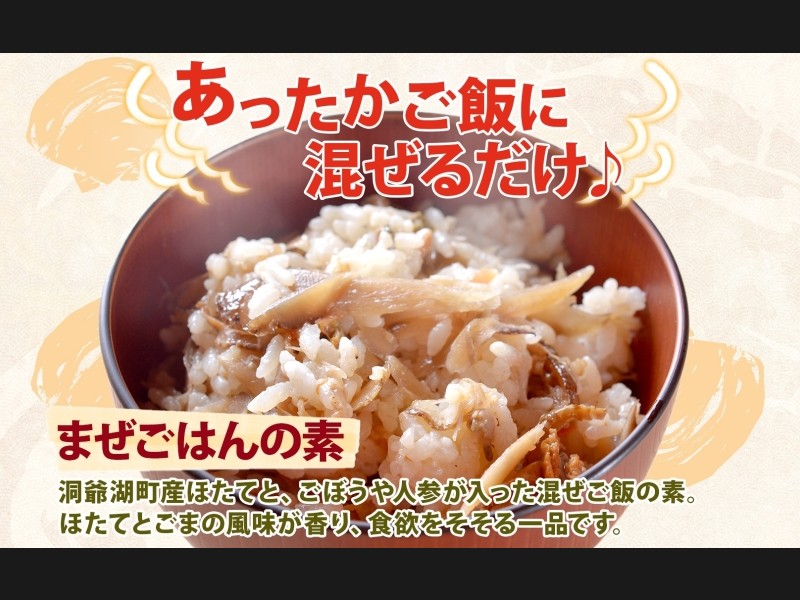 洞爺湖町産のほたての旨味が楽しめる混ぜご飯の素です。