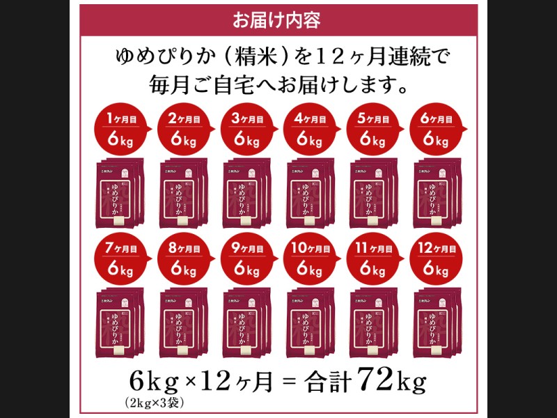 12ヵ月 定期便 ホクレンゆめぴりか(精米6kg(2kg×3袋))※チャック付袋 お米 米 ごはん 精米 白米 国産 ...