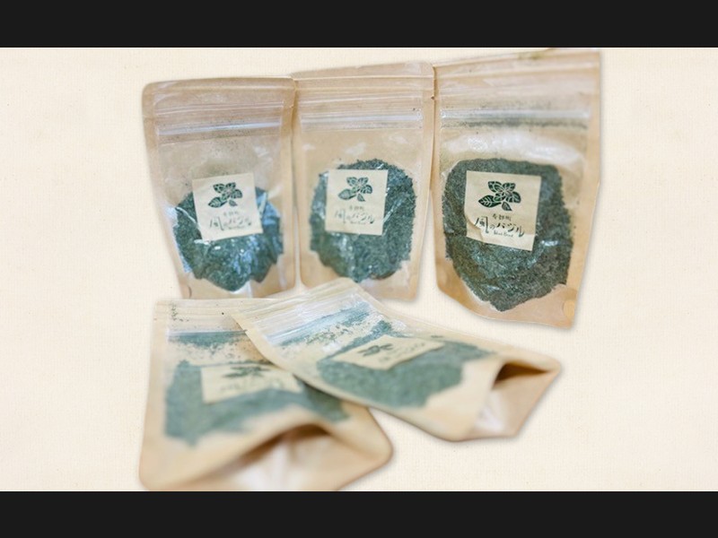 風力発電やバイオマスボイラーのエネルギーを利用したビニールハウスで育てられた、北海道産のバジルを乾燥させ、使いやすいよう粉末状に加工しました。