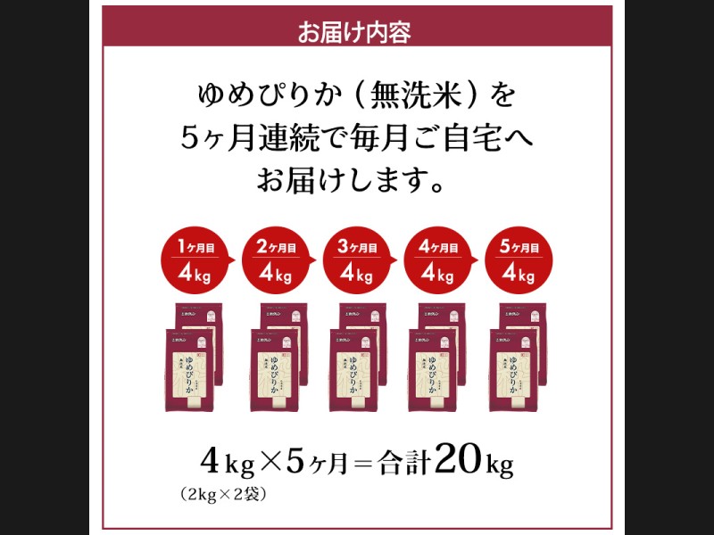 5ヵ月 定期便 (無洗米4kg)ホクレンゆめぴりか(無洗米2kg×2袋)袋はチャック付 米 お米 白米 ごはん ご飯 ...
