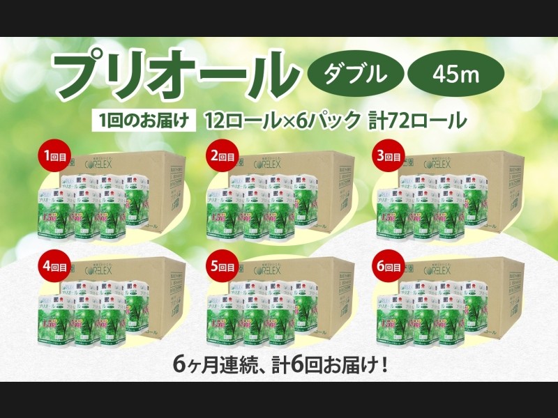 定期便 6ヵ月 連続 全6回 プリオール・ピコ トイレット ペーパー 1.5倍巻き ダブル 45m 12ロール 6パッ...