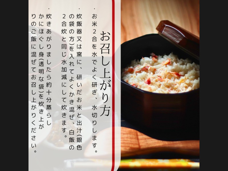 炊き上げ用の出汁とたらばがにの身を別々にパッケージしておりますので、炊きあがったご飯に混ぜ込むもよし、ご飯にのせて楽しむもよし。お好みの食べ方でお召し上がり下さい。