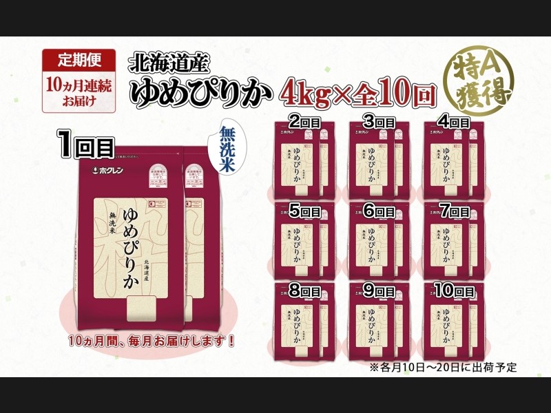 北海道の特A米『ゆめぴりか』無洗米 4kg(2kg×2袋)×全10回をお届けします。