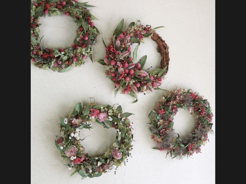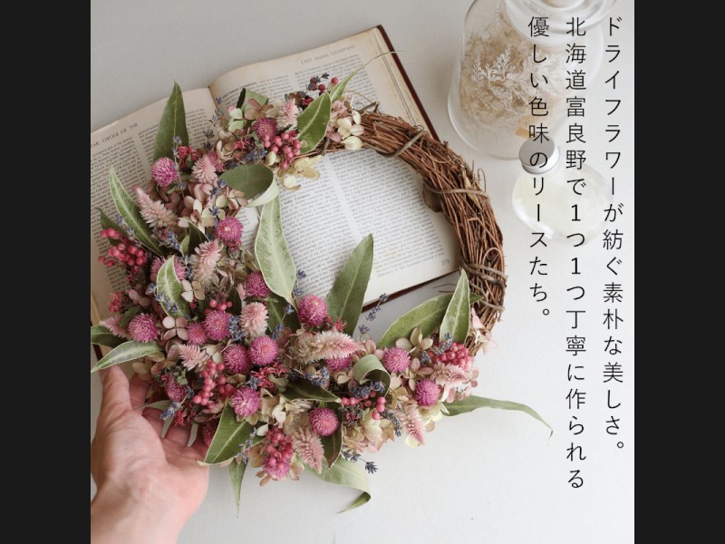 花七曜のこだわりのドライフラワーをつかって北海道富良野で1つずつ丁寧におつくりするリース。