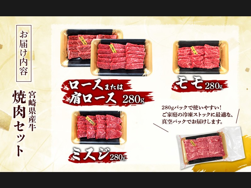 宮崎県産 黒牛 焼肉 赤身 牛肉 焼肉セット ロース 肩ロース モモ ミスジ 3点盛り 840g(280g × 3パック)...