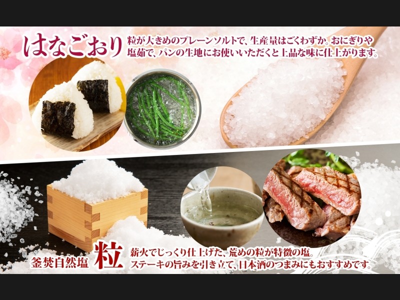 区域内(一部区域外)で採取した海水を区域内の工房で不純物を取り除き、じっくりと煮詰めて製塩し、乾燥、梱包までの一連の工程を行うことにより窯焚自然塩に加工している。