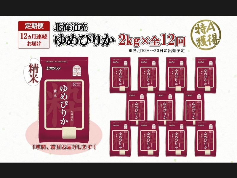 北海道の特A米『ゆめぴりか』精米 2kg×全12回をお届けします。