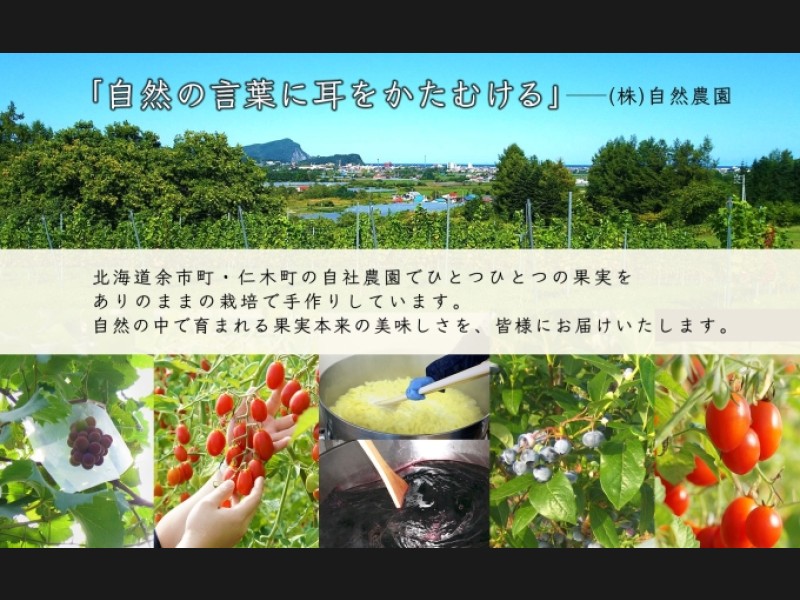 「株式会社自然農園」がいつも大切にしているのは、”自然の言葉に耳をかたむける”ことです。北海道余市町・仁木町の自社農園で、ありのままの栽培にこだわりながら、ひとつひとつの果実を手間ひまかけて手作りしています。皆様に、自然の中で育まれる果実本来の美味しさをお届けできるよう、スタッフ一同励んでおります。