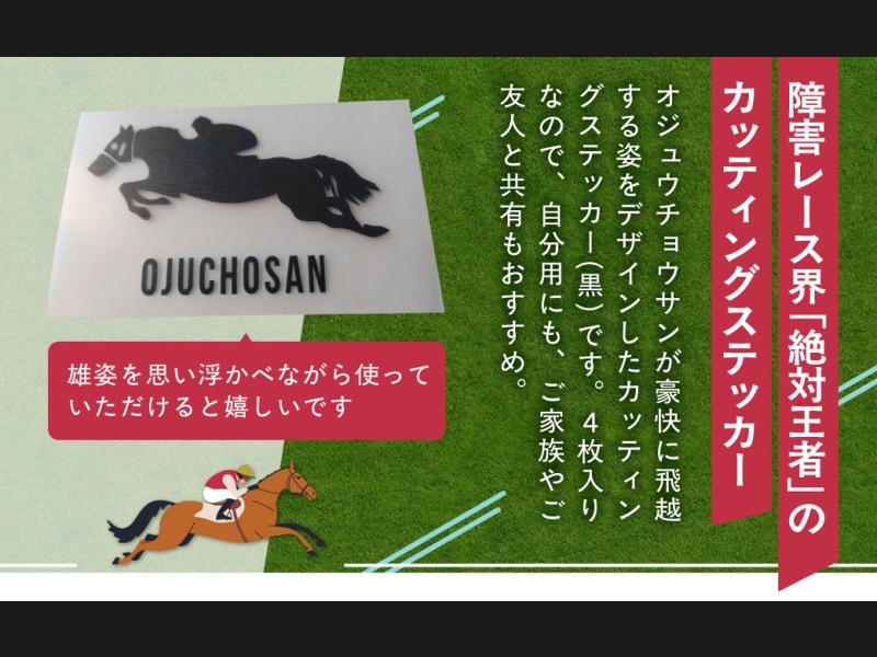 障害レース界の絶対王者「オジュウチョウサン」が豪快に飛越する姿をデザインした様々な物にお貼りいただける、長期用カッティングステッカーです。
