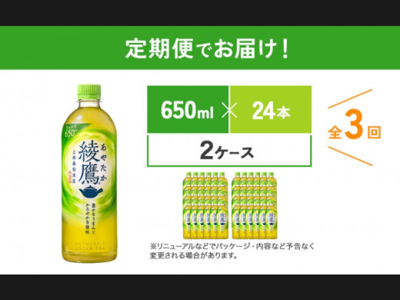 【定期便3回】綾鷹 650ml 合計144本 24本入×2ケース×3回 あやたか ペットボトル お茶 緑茶 コカ・コーラ 3ヶ月 送料無料