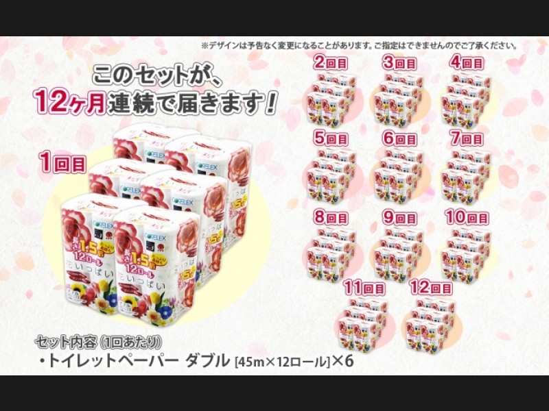 定期便 12ヵ月連続 全12回 長持ち 1.5倍巻き 花いっぱい トイレットペーパー ダブル 45m 計72ロール 全...