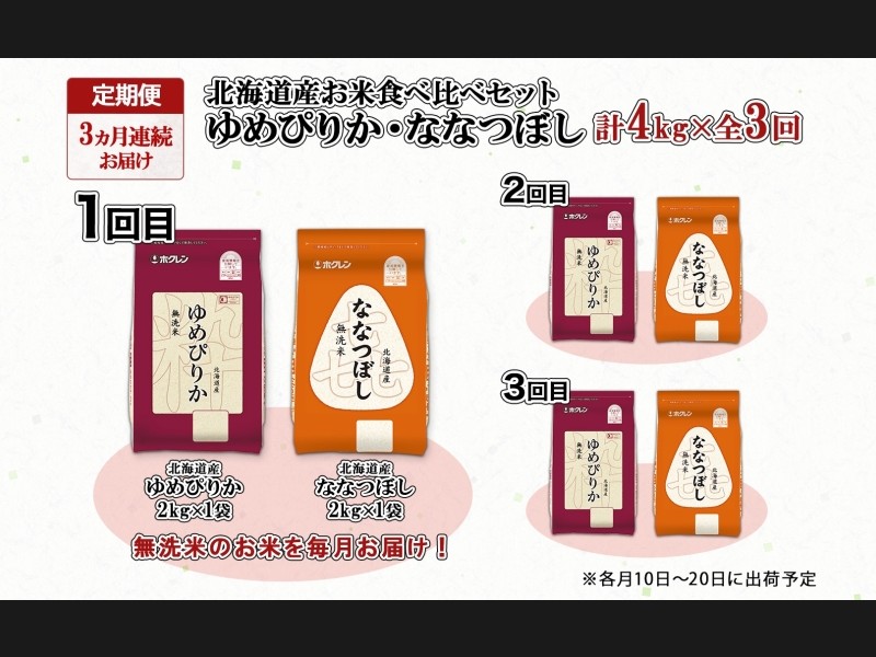 定期便 3ヵ月連続3回 北海道産 ゆめぴりか 喜ななつぼし 食べ比べ セット 無洗米 各2kg 計4kg 米 特A 白...