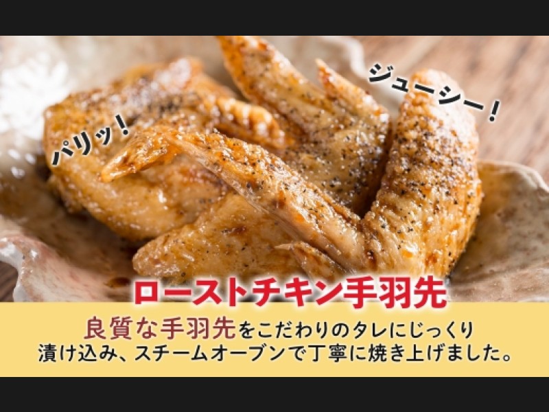 良質な鶏の手羽先を用い、オリジナルのタレにじっくりと漬け込み、その後スチームオーブンで丁寧に焼き上げました。