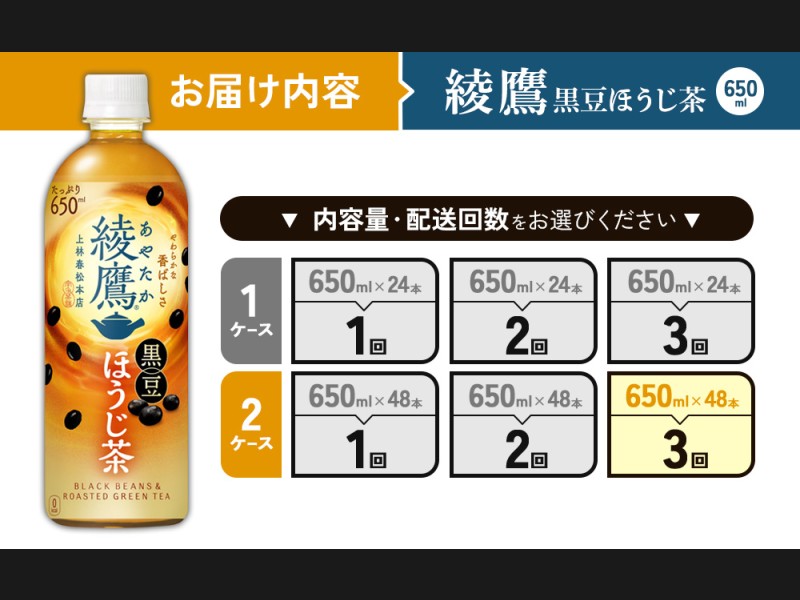 (3回定期便)綾鷹 黒豆ほうじ茶 650ml PET【コカ・コーラ】ペットボトル 2ケース(48本) 定期便 3回(144...