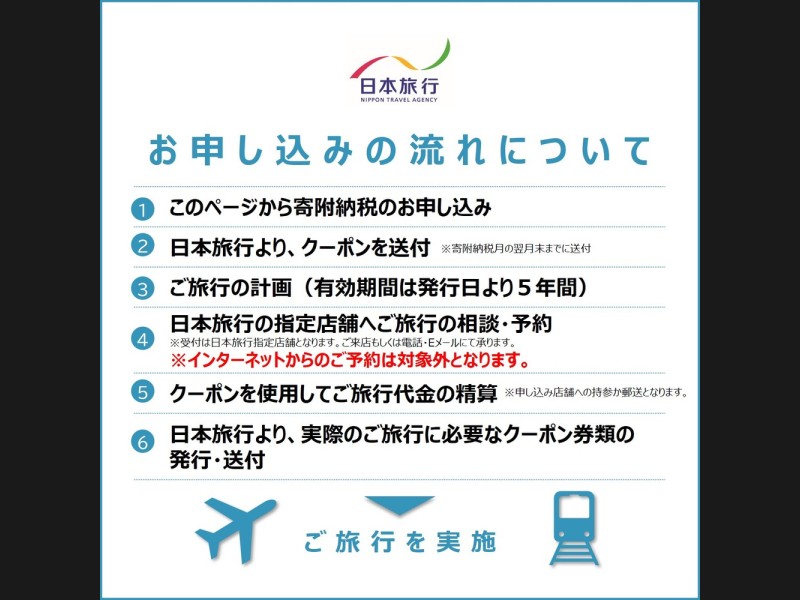 ■寄附のご入金確認後、利用に関する案内書面とともに「旅行クーポン」を郵送にてお送りします。