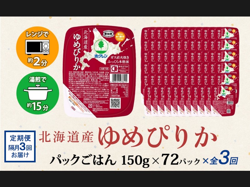 北海道産 『ゆめぴりか』パックごはん(150g) 72パック×全3回をお届けします。