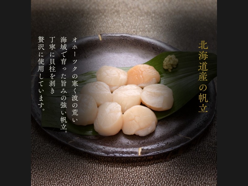 流氷がはぐくむ豊かな海で、毛ガニ・ズワイガニ・タラバガニの三大ガニのほか、ホタテ、鮭などの豊富な魚介類を味わえます。